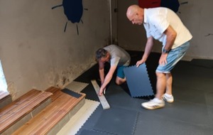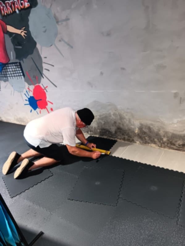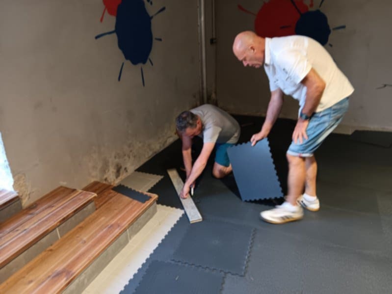 Samedi 09/08 pose des dalles, le plus long étant les découpes nécessaires pour s'adapter aux 3 murs qui ne sont pas d'équerre.